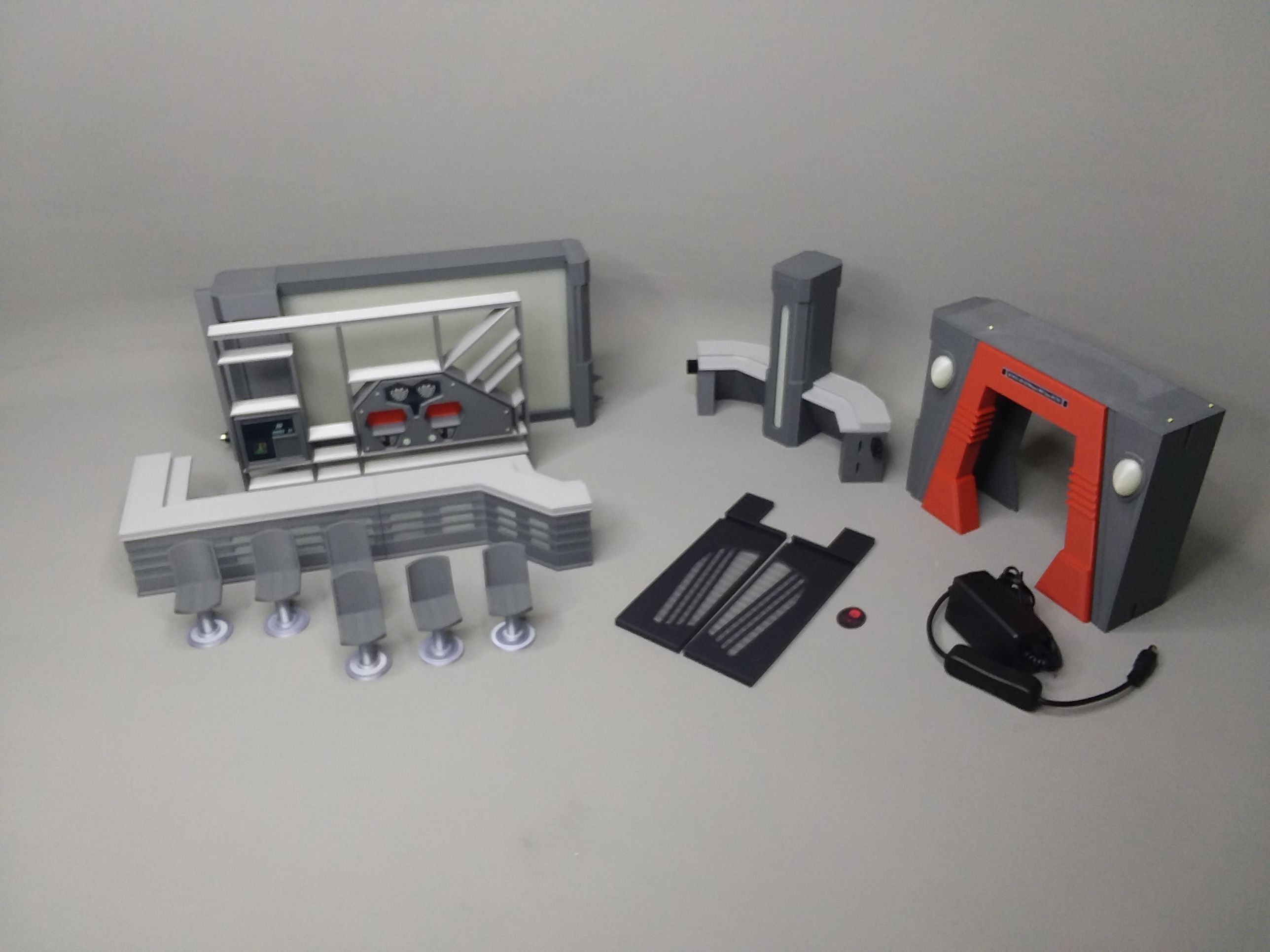 It's easy snap together pieces allow all four main parts to connect together and feature slots to attach future expansion components. Each of the four main parts of the set (bar counter, barback, corner bar counter and main entrance) can have lights installed (lighting is optional) and feature connector plugs which allow each piece to 'plug-in' to each other supplying power throughout the connected parts. The barback shelving is a standalone piece which can be placed behind the bar and includes the computer and replicator which sit on the shelves. They feature high quality printed control panel graphics and semi-transparent red inserts allowing them to be backlit. A total of 6 bar stools are included.