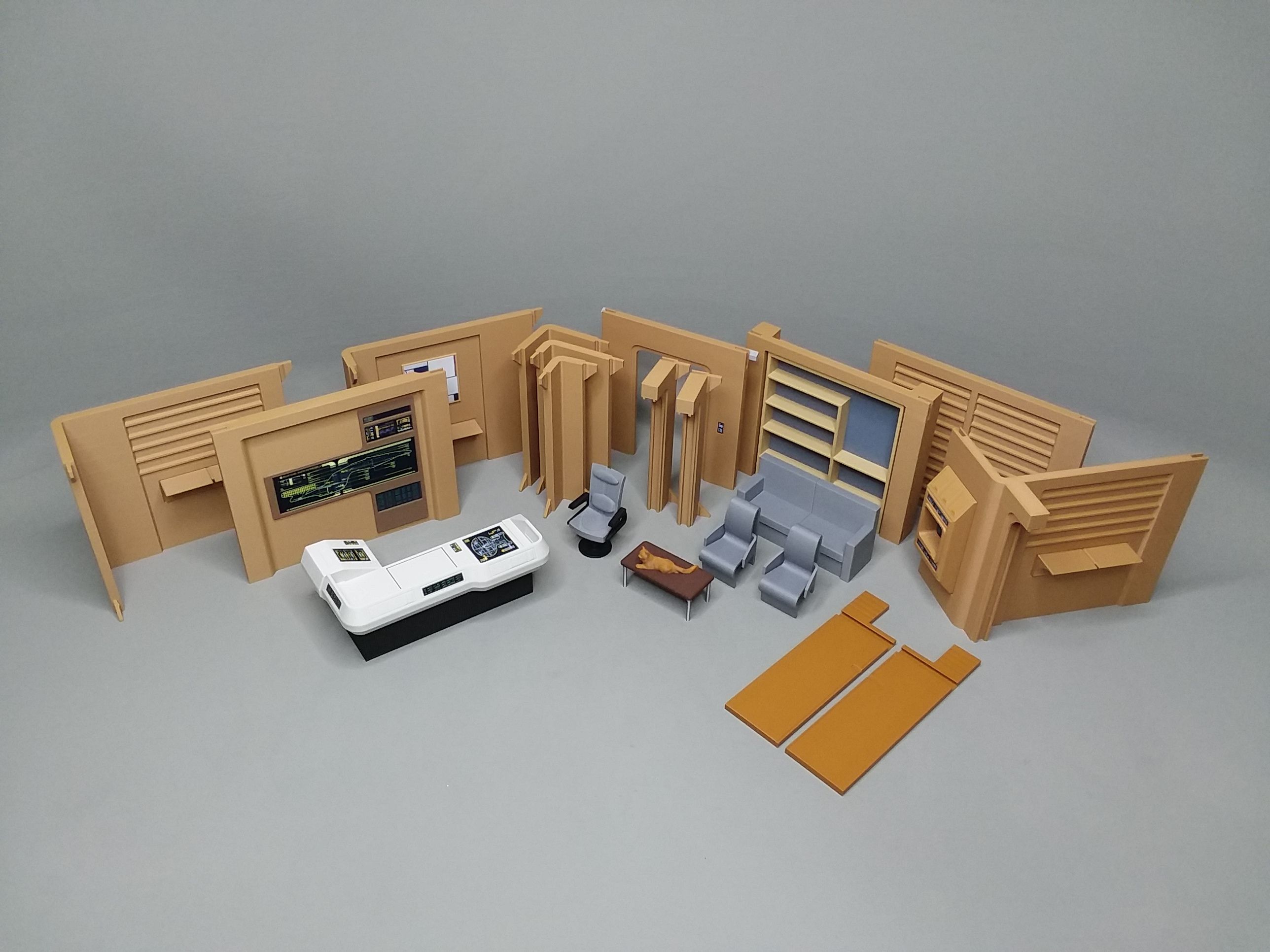 Synopsis/Description: There are many crew quarters aboard a starship but only one specifically designed for an android crewman. This comfortable quarters can be placed together with our Galaxy Class Corridors, allowing your crew to access other parts of the ship. The room includes iconic wall art, a wall mounted replicator, sofa, two arm chairs, one desk chair, large work desk, coffee table, lots of shelving, and a single orange kitty cat. Notably there is no bed in this room because androids don't sleep. The replicator, desk and rear monitor wall all feature high quality control panel graphics for making the 'beep-boops'. The walls of the set snap together easily. This allows you to display the set partially open; Making taking pictures or displaying the set easier. A total of 6 LED spot lights can be attached to the walls and powered by either a connecting corridor or 12 Volt 2 amp US Power Supply.